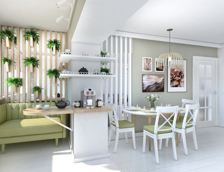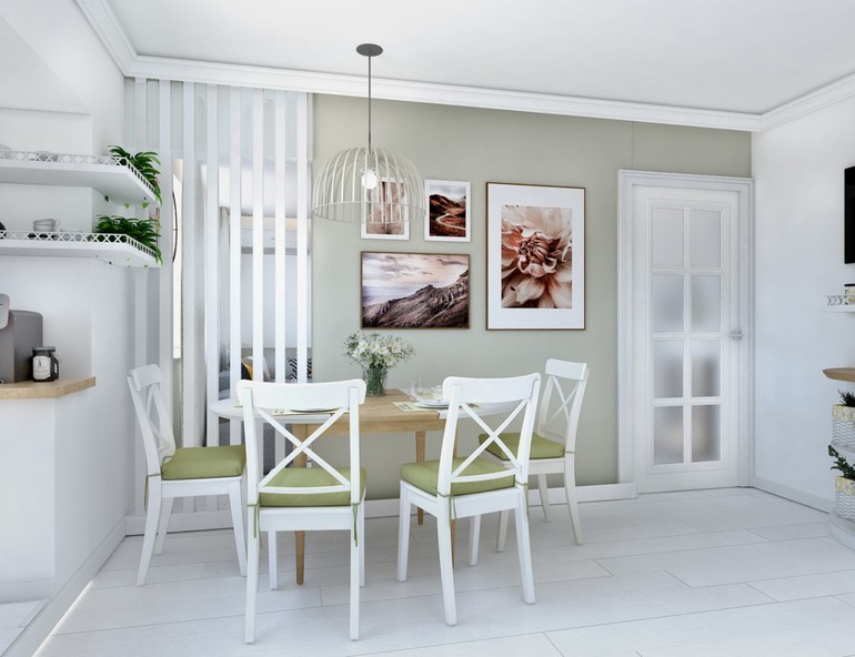 Интерьерное решение кухниСогласовываем проект, но я никак не могу решить. Вариант 1. Распашная дверь. Открываться будет на стену с телевизором (см 2 фото). Плюс в том, что белая стена будет меньше грязниться, декор на оливковом стене не будет закрывать, стульям не будет мешать (хотя места, вроде, в любом случае хватает). Минус в том, что стена с телевизором будет хуже смотреться...