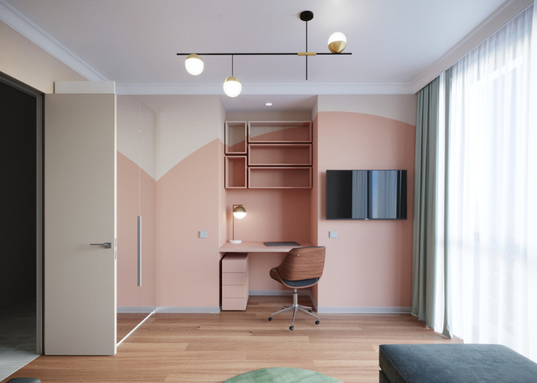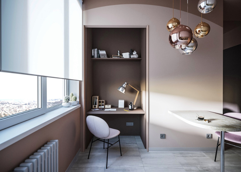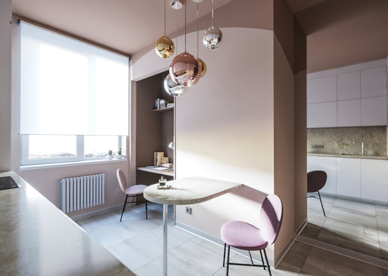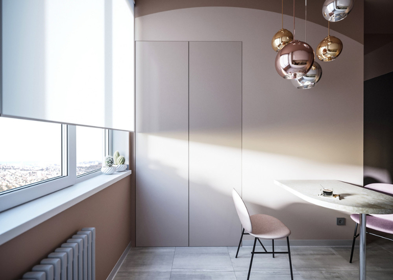 с небольшой обеденной зоной и каскадом зеркальных светильников над ней, прекрасно дополняющую маленький кабинет, расположенный в нише. Даже возможность прятать кабинет за дверьми, которые выдвигаются изнутри ниши не до конца убедила их. Решающим аргументом был перенос из кухни стиральной машины и устройство в коридоре мини-постирочной. А уже размещение в этой маленькой «прачечной» системы для сушки белья с отведением воздуха, привело хозяев в полный восторг: в квартире без балкона сушка белья является большой проблемой.