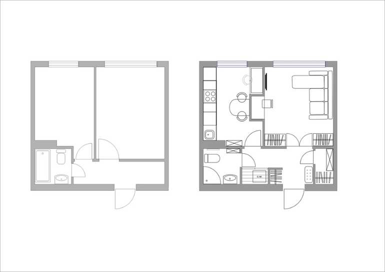 Даже то, что после перепланировки комната стала меньше, нисколько не смутило заказчиков, ведь два зеркальных шкафа, расположенных по обе стороны от входа, зрительно делают её просто бесконечной. Эту же иллюзию поддерживает большое зеркальное полотно в кухне, справа от двери. Вдобавок, расширение коридора позволило устроить в нём кладовку, так необходимую всем маленьким жилищам.