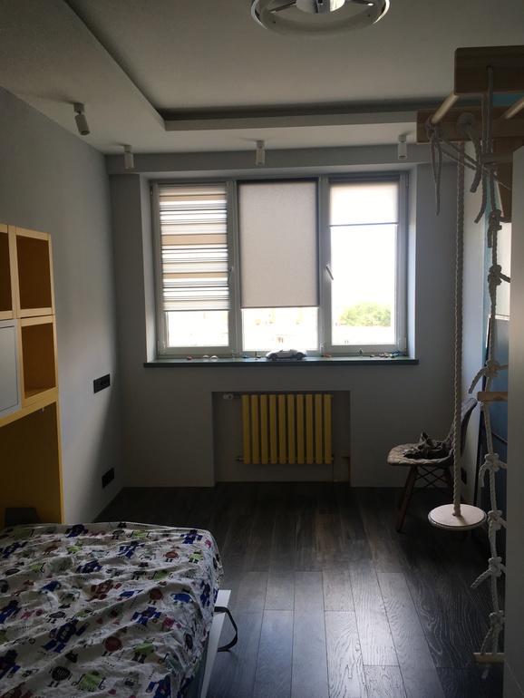 В квартире изначально подоконник хоршей ширины, поэтому решили его оставить как дополнительное место для ЛЕГО. Подоконник из иск камня, зеленого цвета + крутая яркая желтая батарея. Как сказал владелец комнаты, батарея похожа на трансформера.