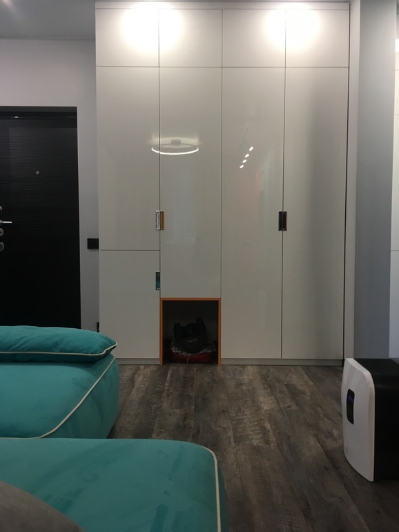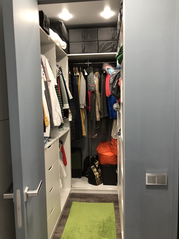 Гардеробная. Сама гардеробная как гардеробная, ничего интересного, а вот дверь в нее стоит инвизибл под покраску. Сейчас такие двери стали популярны. С ними нет сложностей в установке и эксплуатации, их не надо бояться