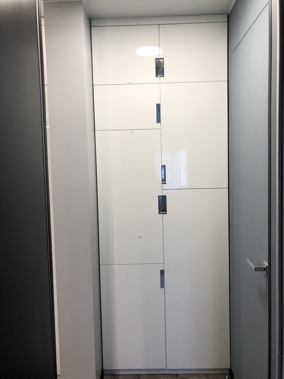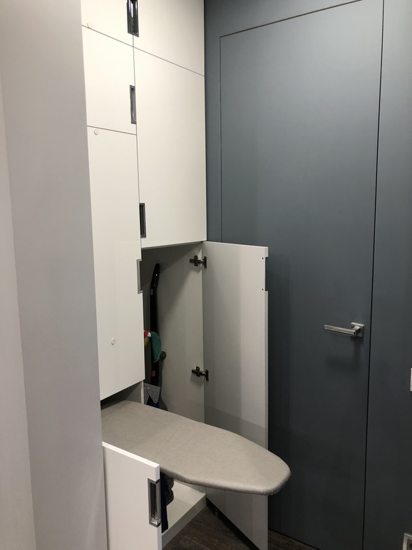 Рядом с гардеробной есть хоз шкаф со встроенной гладильной доской. Удобная опция, с утра маечку прогладить