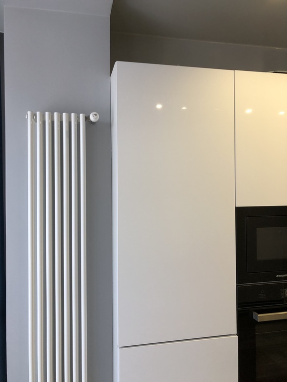 Вертикальный радиатор отопления тоже интересная деталь. Не разорились хозяева на черный (он стоил дороже), а жаль