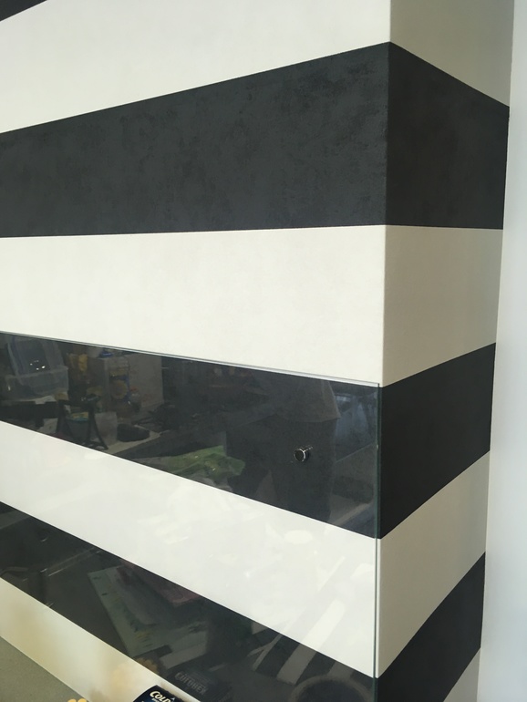 Ну и моя любимая графичная стена. Это обои, фартук прозрачное стекло. Когда на него встанет оранжевый шкафчик, будет шикардос