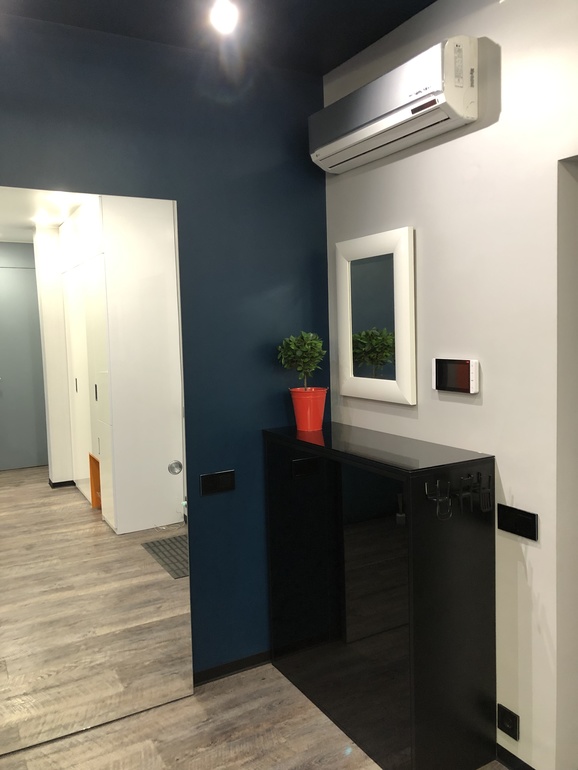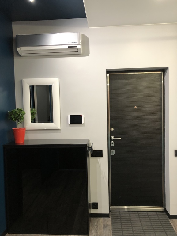 В прихожей нет зеркала, зато есть до безобразия крутая раздвижная зеркальная дверь инвизибл. Оч крутая дверь, она как будто плывет по воздуху.