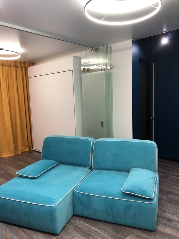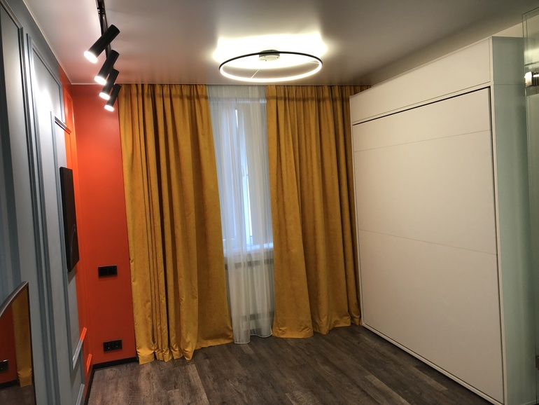 Т.к. комната является спальней, решили использовать кровать-трансформер. Складываем кровать, двигаем диван и получается нормальная гостиная. Как сказала хозяйка: "Кровать-шкаф это вещь". Для зонирования спальни от гостиной есть стеклянная перегородка. Ей хозяева пользуются редко. Когда хозяйка сидит с подружками на кухне, а мужу надо отдохнуть. Кому интереснее про стеклянную перегородку, есть отдельный пост тык