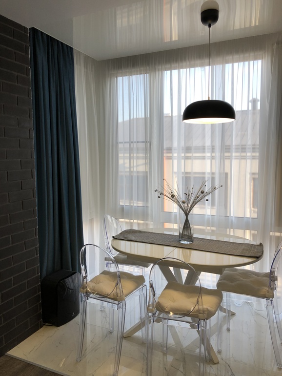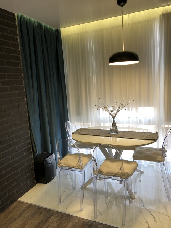 Возле окна стол со стульями - вечером, с подсветкой получается очень уютный уголок. Вот, кстати, тут видно работу с цветом. На фоне темно-коричневого кирпича (теплого цвета), холодные пыльно-синие шторы, на полу белая плитка под мрамор и теплый ламинат. Интерьер построен на контрастах и смотрится эфектно