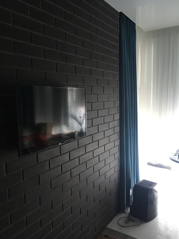 Стена с телеком в брутальном кирпиче, который смягчается уютными шторами