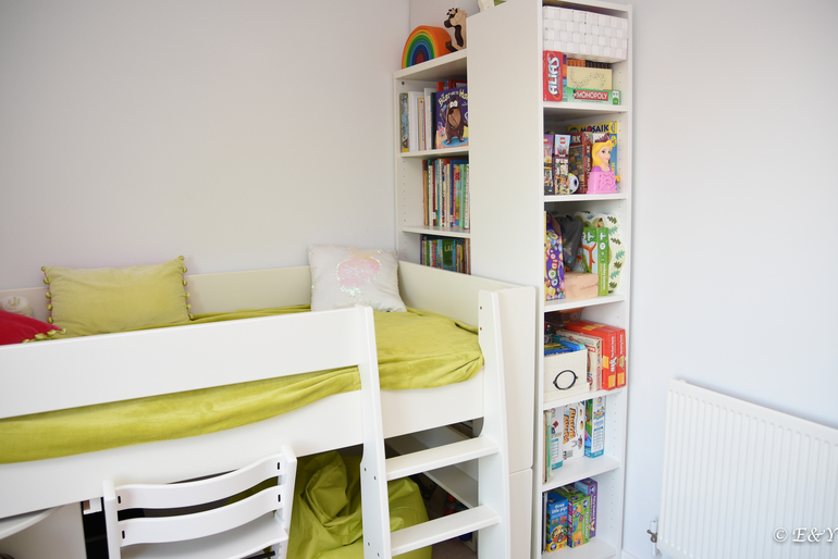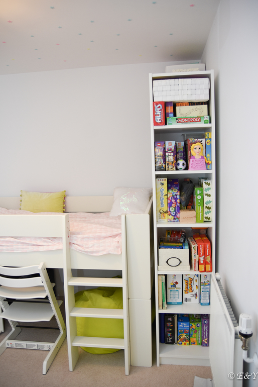 Сбоку идеально встал шкаф для книг (и кстате оказалось дочке очень удобно выбирать книжки уже будучи в кровати). И рядом со шкафом мы поставили полку для настольных игр. Вписалось все как встроенная мебель прям!