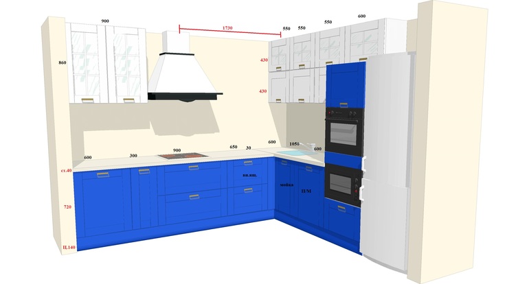это наша кухня,правда ещё в процессе.Очень похожа на вашу.У нас посудомойка сразу справа от мойки,которая будет в углу.И как уже сказали,то я бы убрала шкафчик ,который слева от вытяжки вверху.Как по мне,то он лишний....