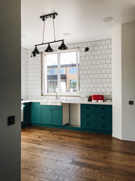 У нас к бирюзовому гарнитуру белая плитка и белая краска)