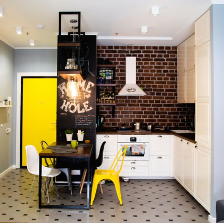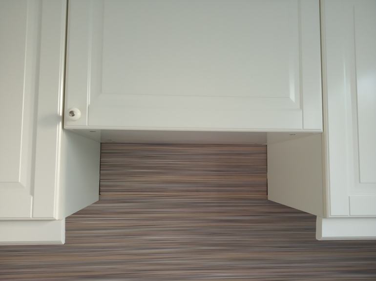 Нормально смотрелас ,мы брали в тон,а труба по верху шкафов шла в вентиляцию,нам было нормально и красиво)