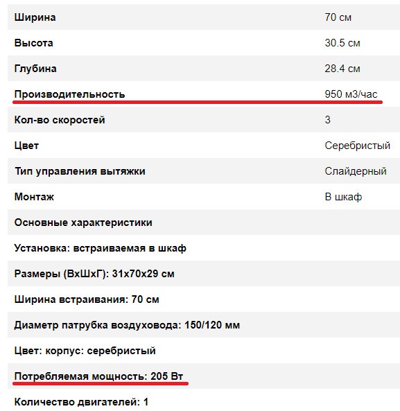 Главное в вытяжке - это производительность, как видите, здесь она может быть значительная при невысокой цене. А мощность - это количество электричества, которое вытяжка будет брать при работе. Хорошее сочетание, когда низкая мощность и высокая производительность. Вот еще вытяжка такого плана: