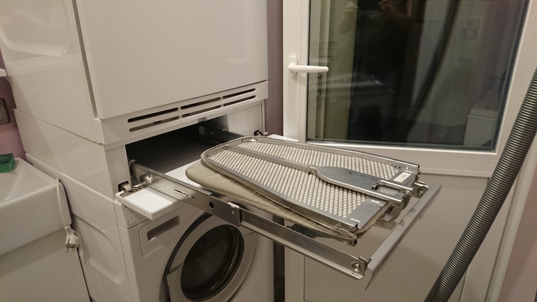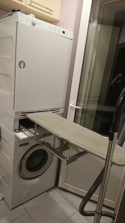 Может не совсем поняла вопрос.. Ставится стиралка, потом сверху какой-то крепёж и потом можно поставить сразу сушилку. А можно, между ними, установить блок с гладильной доской. Или блок с ящиком для сбора белья. Мы взяли гдадильную доску. Очень компактно и удобно получилось))