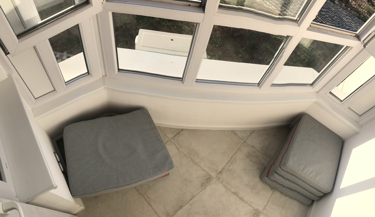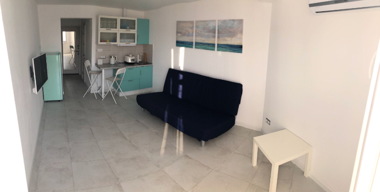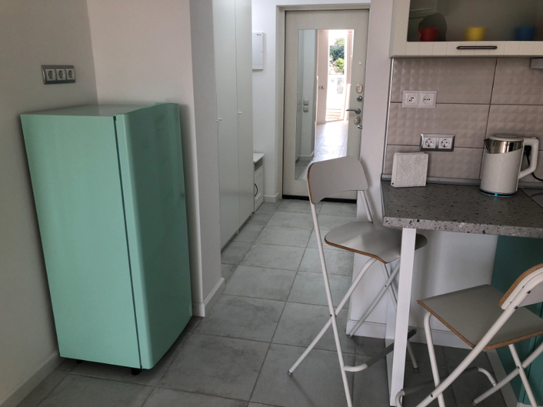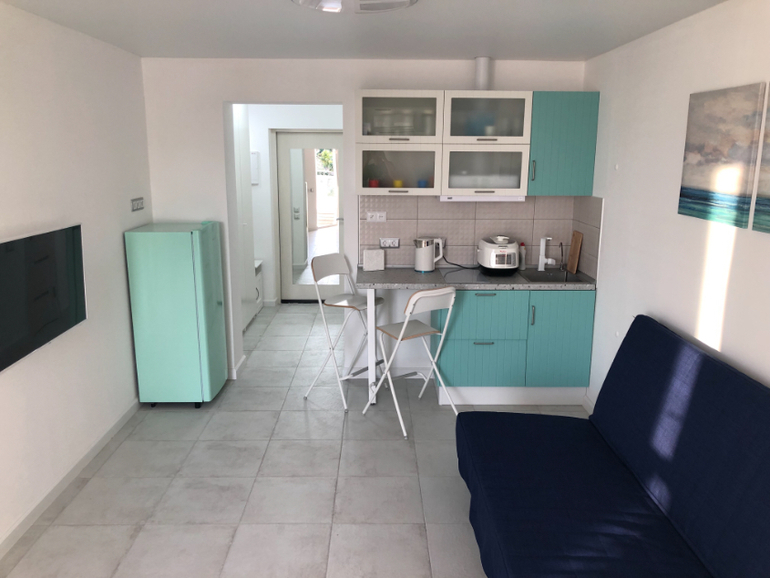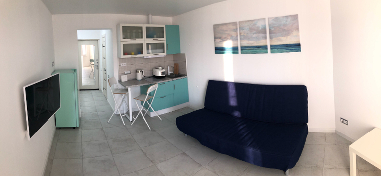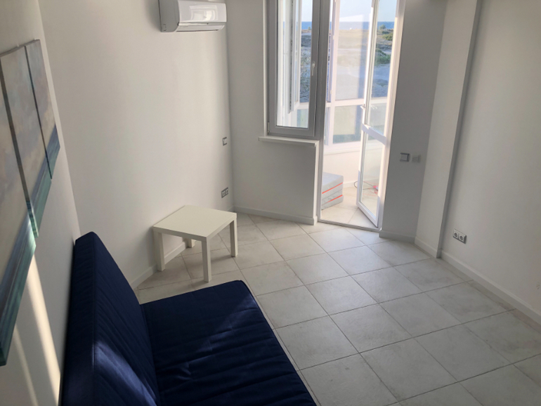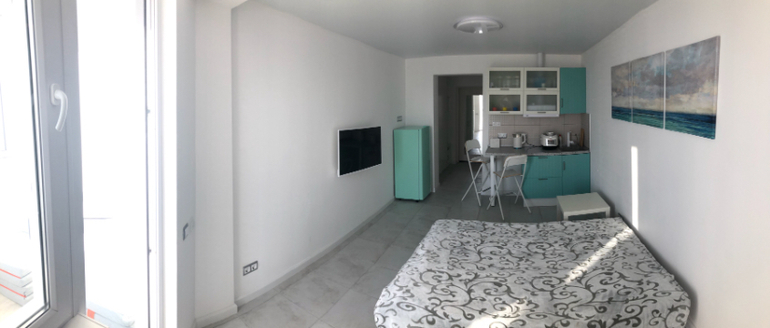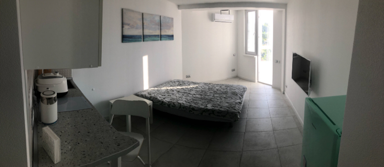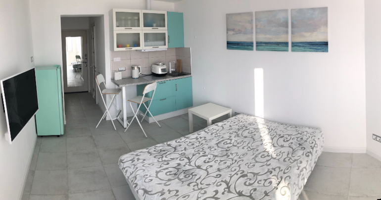 Вид из окна - красота. Но дизайн студии очень уж угнетающий. Напоминает больничный бокс. Светлый деревянный (или под дерево) пол и деревянные стулья, например, решили бы эту проблему. И пару ярких деталей хорошо бы добавить. Тумбочки без ящиков в таком маленьком помещении, где и так мало места для хранения мелочей. И одна лампочка на все помещение. Понятно что оно маленькое, и этого, возможно, хватает. Но около дивана бра какое-нибудь все равно актуально и места не займет ни сколько.