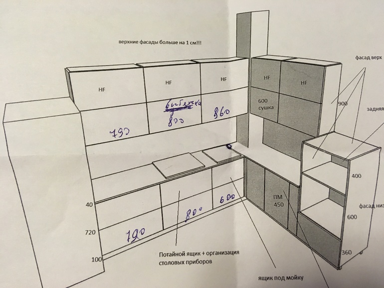 Фасады на 1 см больше, потому что они без ручек, так удобнее будет дверцы подцеплять. Это не будет заметно, потому что сбоку на них нигде не посмотреть.