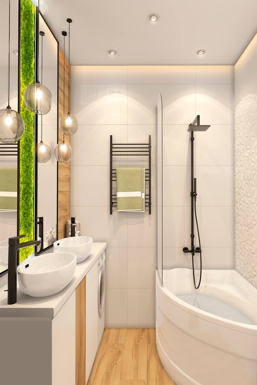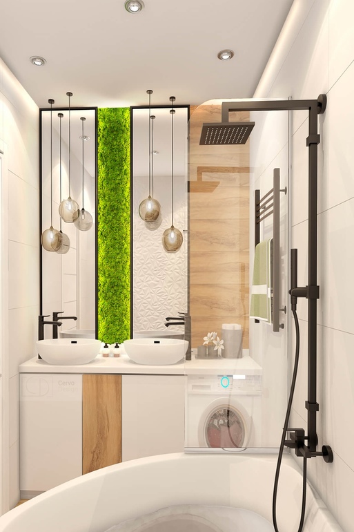 Для Натальи спроектирована отдельная ванная комната с большой ванной и стиральной машиной. На стене белая фоновая плитка с 3D акцентом за ванной. Чтобы смягчить ее холодный тон, на полу использована плитка под дерево. Вертикальное озеленение добавило ванной уюта и красок 😌.