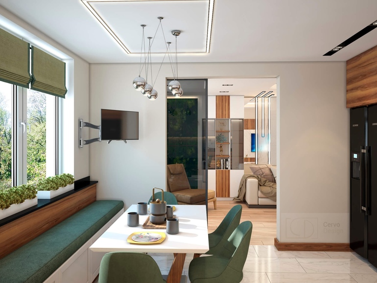 В гостиной использовала те же оттенки цветов и материалов, что и на кухне, чтобы был плавный переход. Комната вытянутая, а проем на кухню занимает место, поэтому я решила выделить зону для чтения у окна потолком и вертикальным озеленением. В зоне TV расположила вместительный диван, над которым на потолке светодиодные профили с переходом на стену. Такая идея очень понравилась Андрею и Наталье. На стену за диваном добавила напольный керамогранит из кухни, лёгкие 3D панели от Artpole и зеркала для увеличения пространства. В отделке стены использована шпонированная стеновая панель в тон кухонным фасадам, за TV - конструкция из гипсокартона толщиной 5 см с подсветкой по периметру. Подвесные тумбы и буфет будут произведены на заказ в тон кухонному гарнитуру.