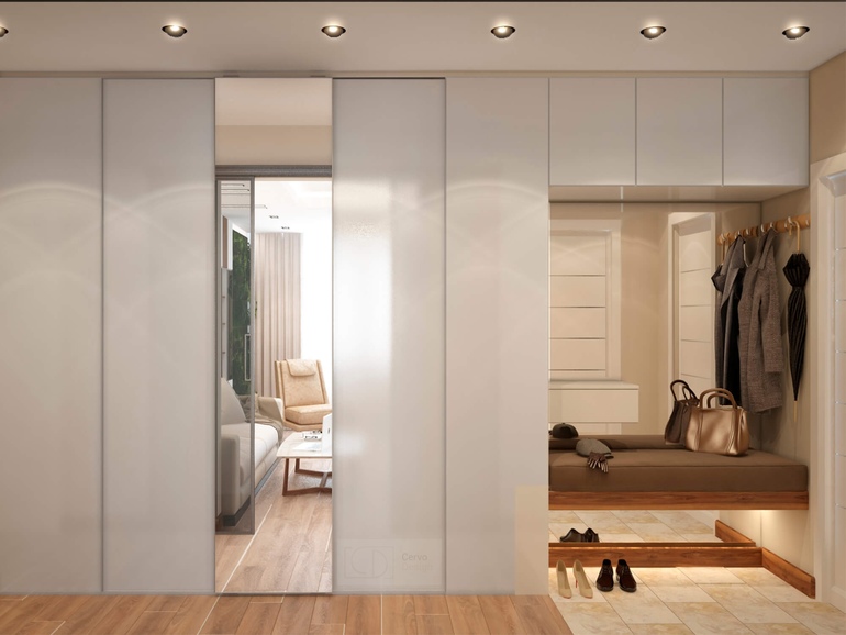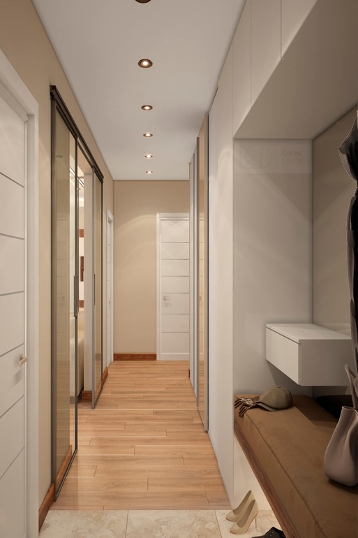 При входе в прихожей использована подвесная парящая мягкая лавка из дерева, под ней можно поставить обувь, чтобы не мешалась на проходе. За лавкой большое зеркало в пол, что визуально увеличивает входную зону. Здесь же удалось расположить вместительный шкаф: по центру 3 двери купе со штангой внутри, а по бокам распашные двери: справа для обуви, слева для пылесоса и гладильной доски.