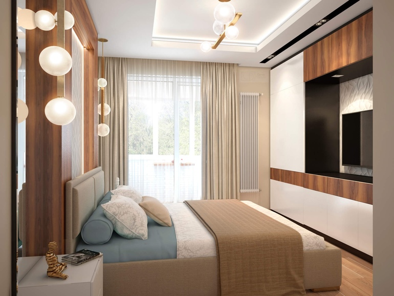 Спальня выдержана в современном стиле, в изголовье вставка из керамогранита с деревянным обрамлением и подсветкой.