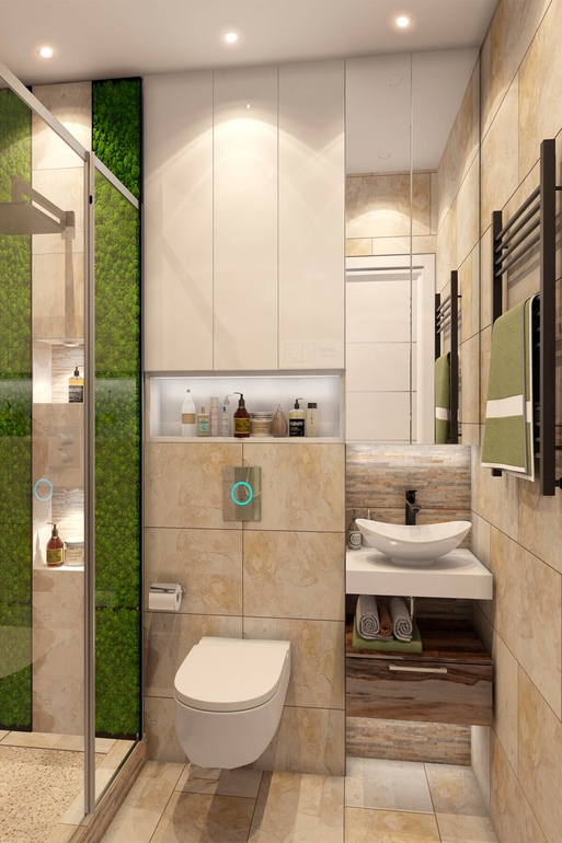 Санузел удалось расширить и разместить в нем душевую кабину, так как Андрей предпочитает контрастный душ утром и вечером, после спорта 💪. В ней сделано вертикальное озеленение и добавлены полочки для шампуней. На полу в душевой кабине - галька, она приятна и полезна для ног. Плитку подобрала в компании Italon, натуральный и тёплый оттенок под камень создаёт тепло и уют.