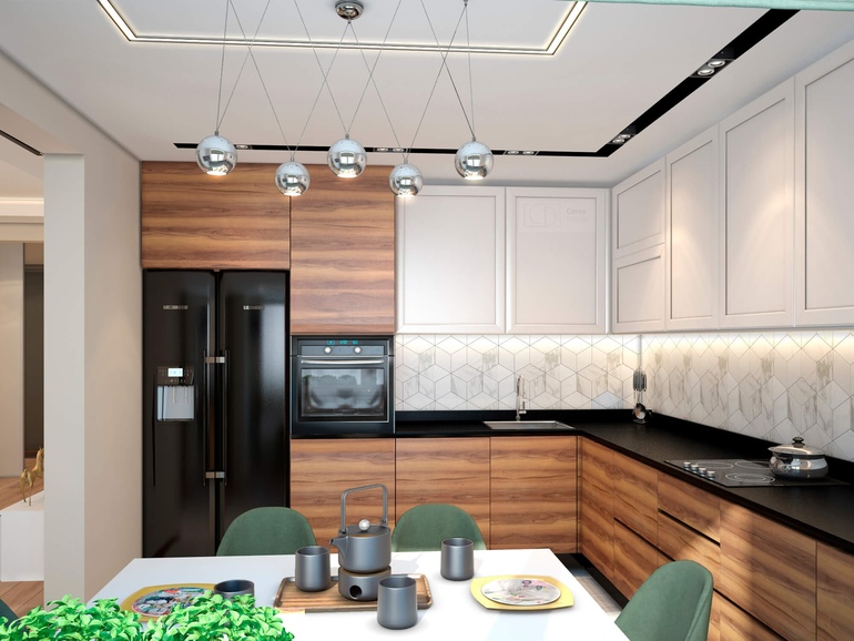 В планировке от застройщика было два входа на кухню - со стороны коридора и со стороны гостиной. Вход со стороны коридора решила закрыть, чтобы увеличить длину рабочей поверхности кухонного гарнитура, ведь Наталья очень любит готовить 💃. Дизайн кухонного гарнитура подбирала под основную идею озеленения в квартире. На полу керамогранит под белый мрамор от Atlas Concord большого формата, с ним же в коллекции идут несколько декоров. Для фартука подобрала интересный, но лёгкий рисунок.