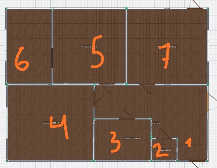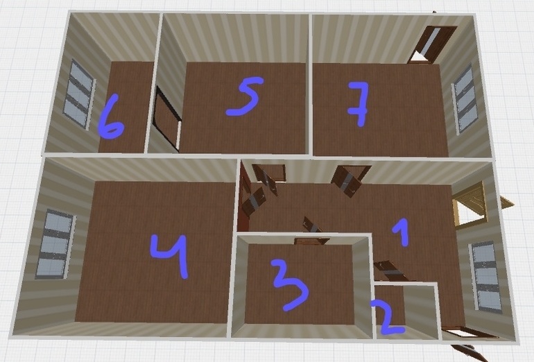 Сначала я с мужем были в 7 комн, а дети в 5 и 6. Но они были поменьше и собирались в одной комнате и там где я. Потом я с мужем переехали в 6 маленькую. Дети в 7. Но сейчас дочь просит свою комнату и спит в 5 в гостиной. Старший сын один не хочет, страшно ему, говорит ему с братиком хорошо, не мешает. Проблема вот в чем. Мне неудобно. Маленькая спальня, в ней у мужа и комп и все для компа, он частенько работает дома программами компами занимается, много мелких деталек, все это на кухне в основном занимает место на кухонном столе, где едят дети и конечно что то да прольется. Все мои вещи, косметика, фены щипцы, а так же хобби вязание и пазлы всё это в комнате 5 темной. Мне не хватает света. Плюс теперь там дочь и соответственно и маленький постоянно к ней. Не могу поделить эти комнаты так чтобы всем было хорошо. В ииоге я постоянно на кухне, и муж на кухне, ведь там телик, и получается мы с ним как бы щанимаем две комнаты, но находимся всегда рядом на кухне, что иногда раздражает. То есть своей комнаты у меня в доме нет, отдыхаю только на кухне. Как бы Вы поступили и распланировали? Думала о кабинете для мужа, но незнаю где его сделать, в какой части дома ))) Глобальные перепланировки как если поменять кухню местами, пока не рассматриваю, это второй этаж и все эти трубы вряд ли муж захочет переделывать. Кладовки это уши от крыши, там можно ходить в полный рост.