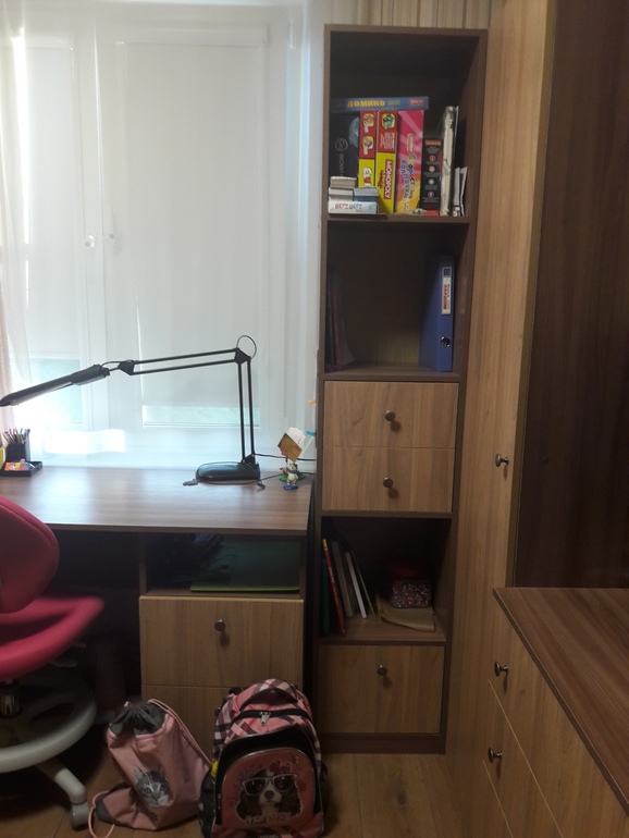 Ну и окна стол и шкаф-пенал. Для учебников, канцелярки и настолок