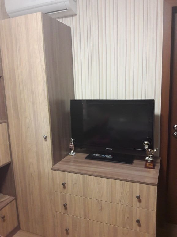 Напротив кровати комод с телевизором, шкаф
