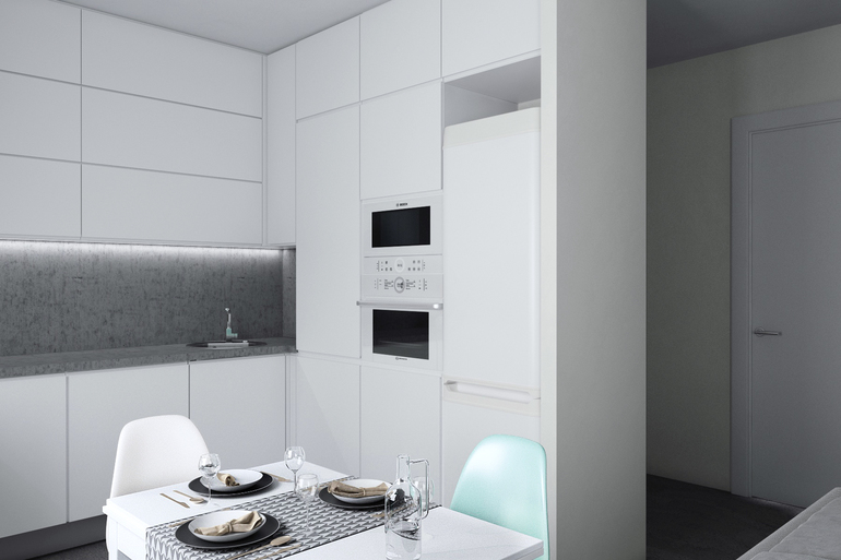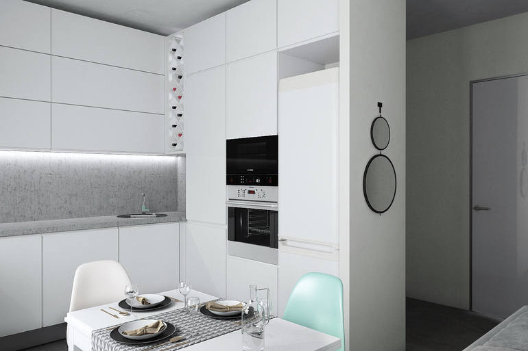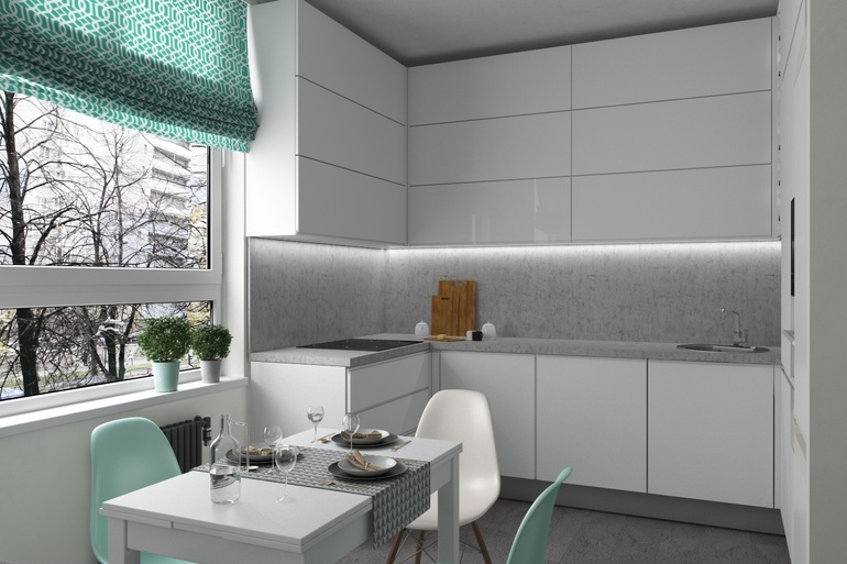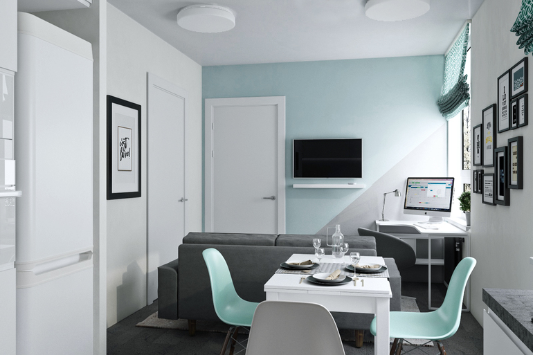 На пол постелили пробку. Чтобы не возникало ощущения загромождённой мебелью, заказчики выбрали скандинавский стиль: монохромную цветовую гамму разбавили мятным цветом, который очень любит хозяйка квартиры.