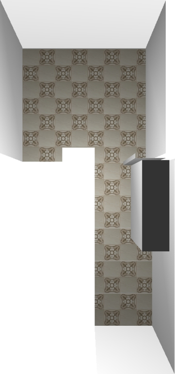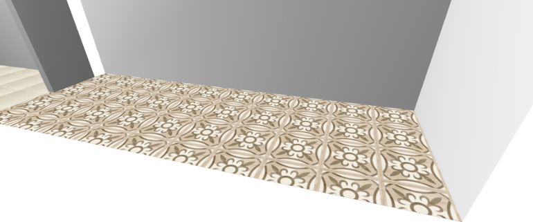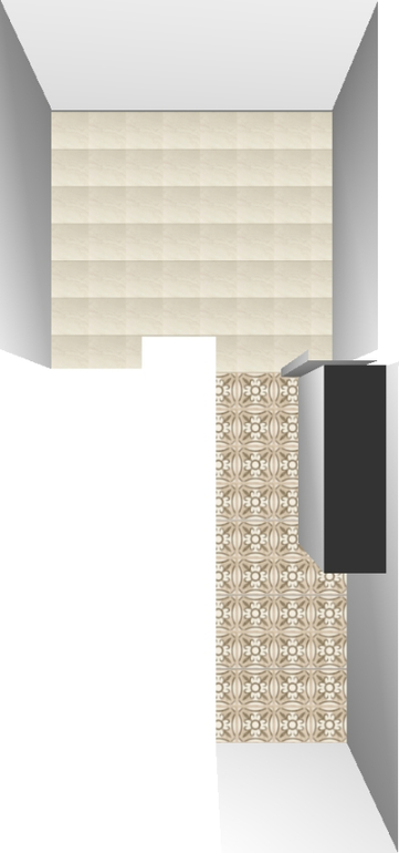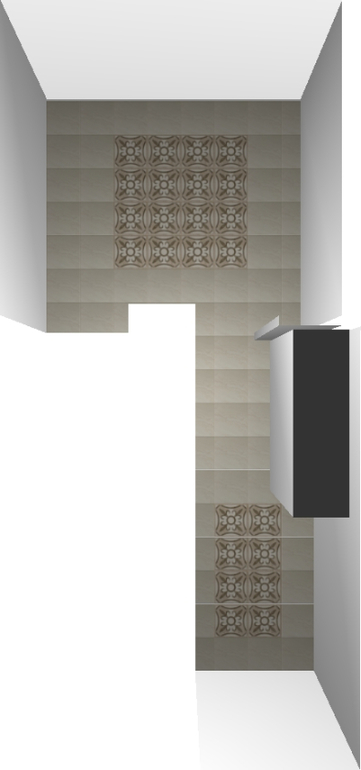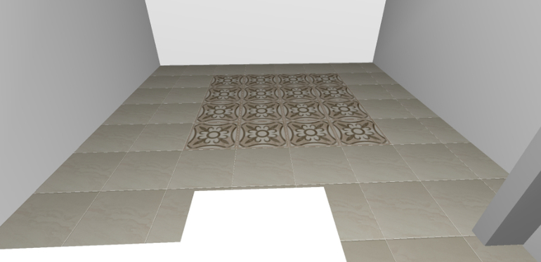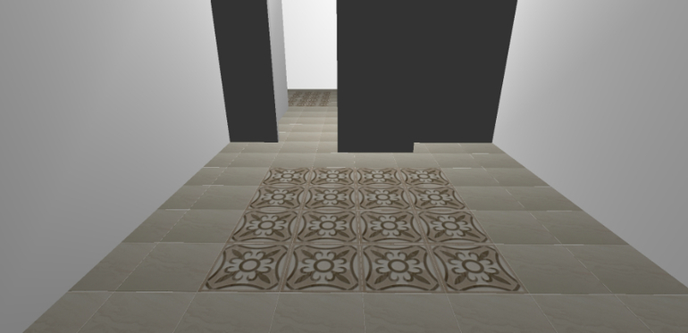 мне больше нравится однотонный вариант, без рисунка. рисунок, особенно часто расположенный, очень удешевляет вид.если уж вам так сильно хочется, то я бы оставила квадрат с коридоре, а прямоугольник не стала бы делать. но такой рисунок хорошо выглядит в пустом помещении, без мебели