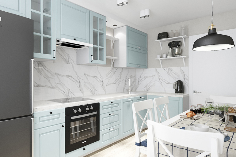 Вместительные шкафы в сочетании с воздушными открытыми полками.