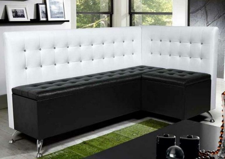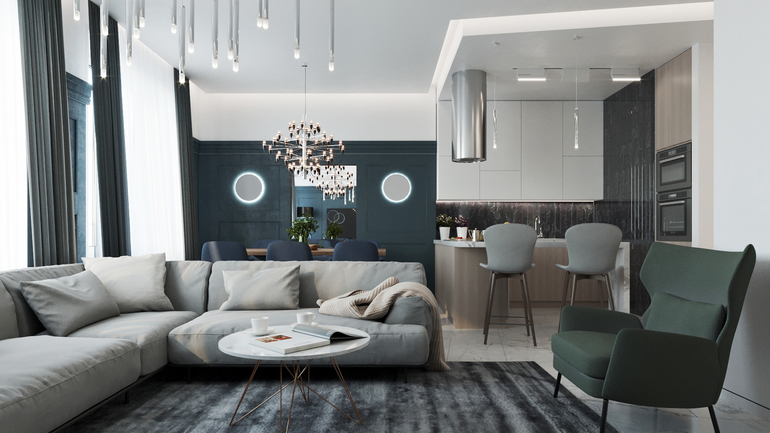 Мне сразу видится такой же чёрный, а скорее темно серый стол, как низ кухни. Диван любой может быть.