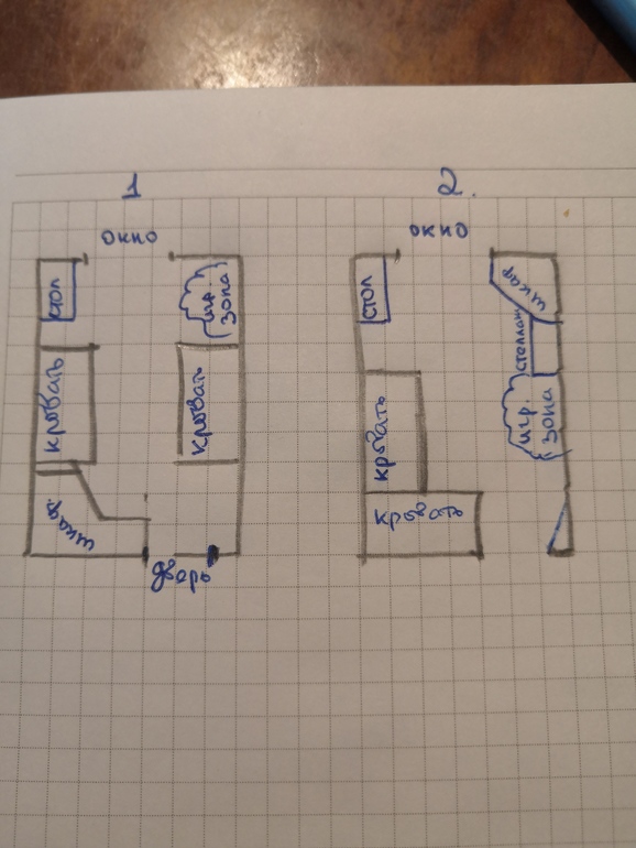 комод и коричневый шкаф уберём. Нужен будет шкаф, скорее всего угловой, чтоб ставить коробки с игрухами в него, небольшой стеллаж и парта для дочки. И место для игры. Склоняюсь, чтоб в правый угол у окна впихнуть угловой шкаф и небольшой стеллаж вдоль стены (вар 2). Но думаю, не пропадёт ли совсем окно от этого шкафа? Он же объёмный, наверное.. Либо ещё вот как на варианте 1. Кровати вдоль стены параллельно драг другу и в угол у двери шкаф и стеллаж.. Но так тоже не особо,заходишь и тут же стена шкафа слева..