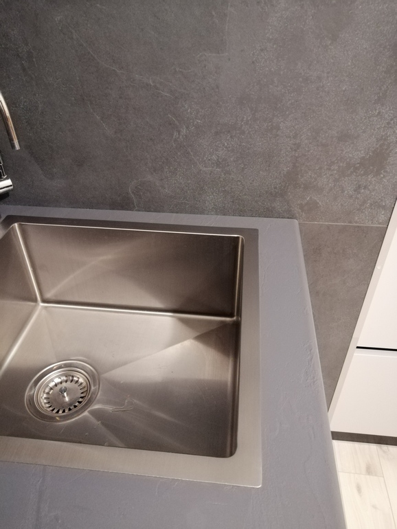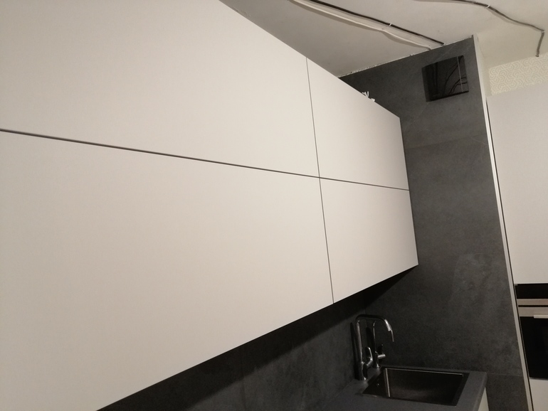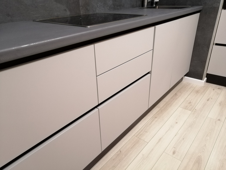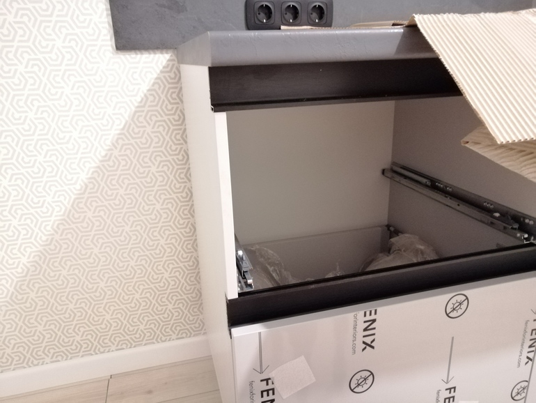хотели столешницу загнать под плитку и обойтись без плинтуса... не получилось.... 0,5см не вошло - из-за ручек высота нижних ящиков вышла чуть выше. придется искать плинтус самый маленький....