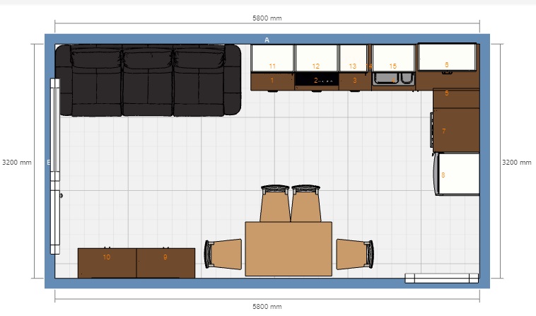 Вариант 2. Кухня с прямоугольным столом и холодильником справа