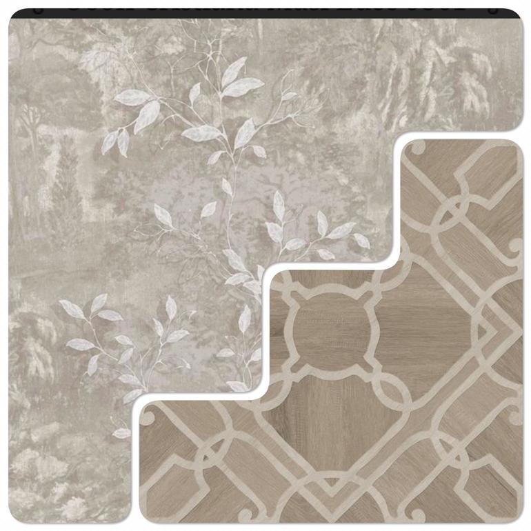 К таким обоям подойдет какая нибудь моноколорная плитка, по типу Cersanit Avangarde или на подобии. Или наоборот геометрию на плитке сочетать с моно обоями, но у вас как то перебор)