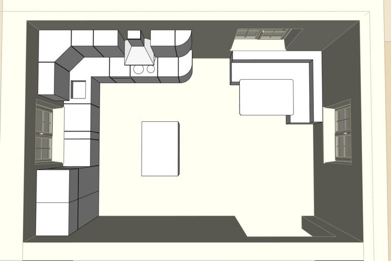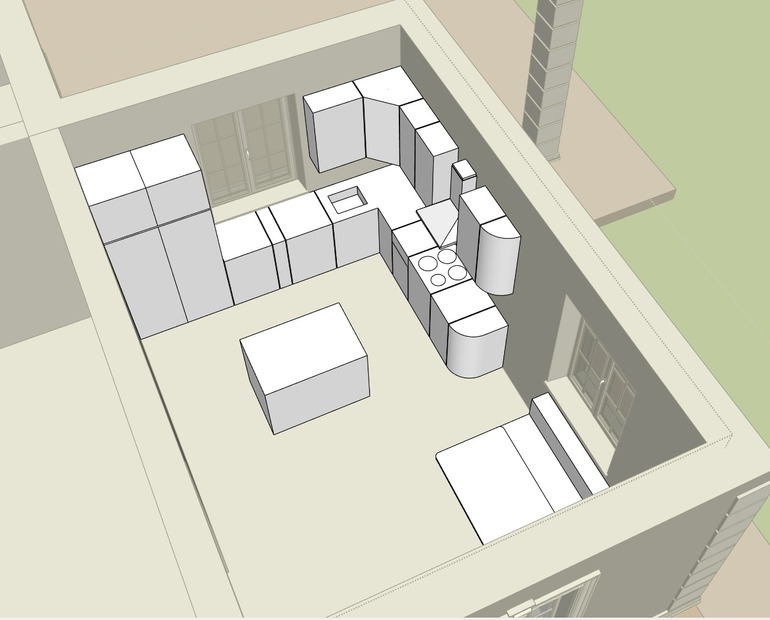 26.10.2019. Уже всю голову сломала. Хочется и окно, и остров, и духовку на уровне глаз. Всё вместить не получается. На данный момент получилось так. Мужу не нравится остров, говорит, что бесполезная вещь - никто сидеть за ним не будет - действительно так?!