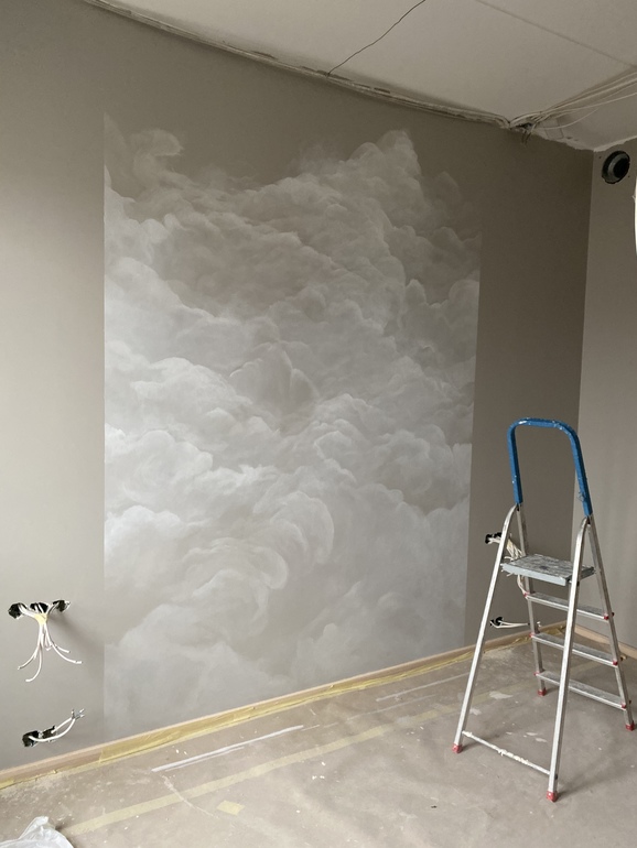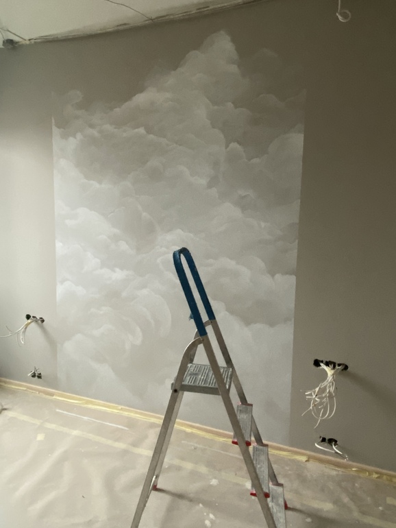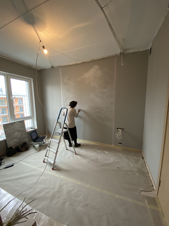 Интерьерное решение спальниВчера вечером художница завершила работу над нашей спальней. Теперь остались выключатели, розетки, лампы, потолок и мебель. За следующую неделю должны все закончить🙏🏻