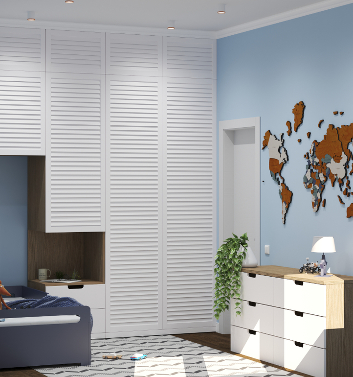 У кровати у нас место для хранения одежды, сделали интегрированную в шкаф прикроватную тумбочку, "как у взрослого".