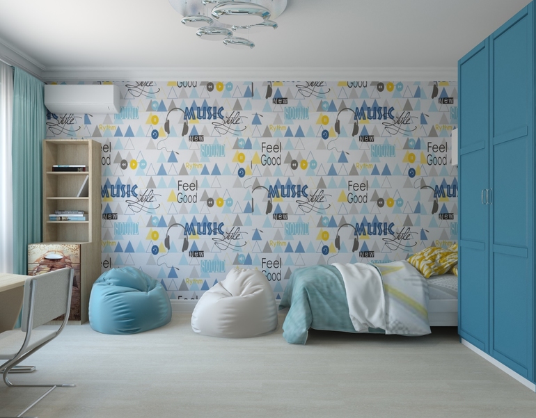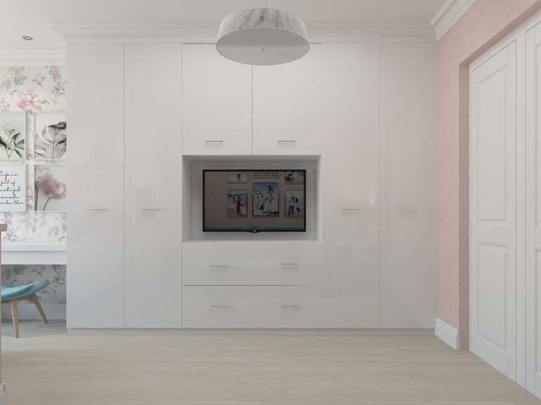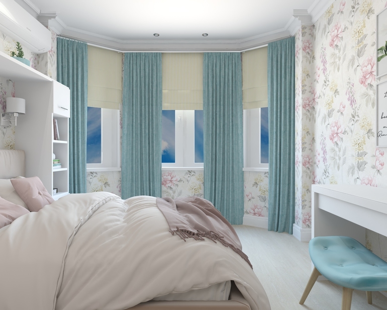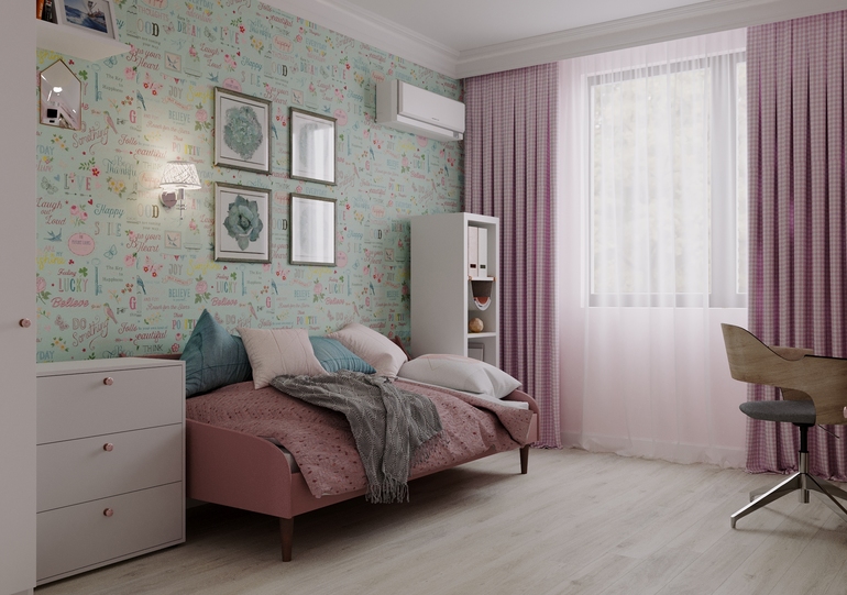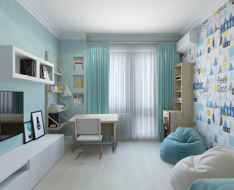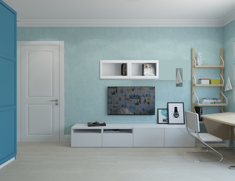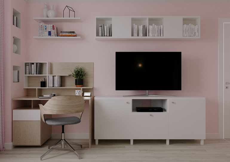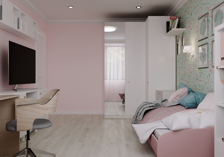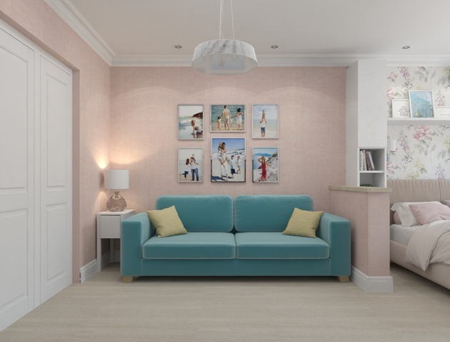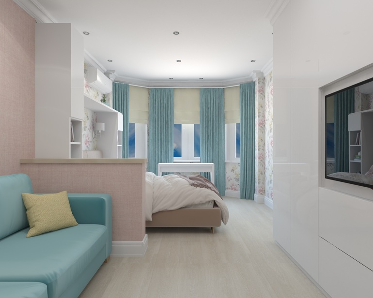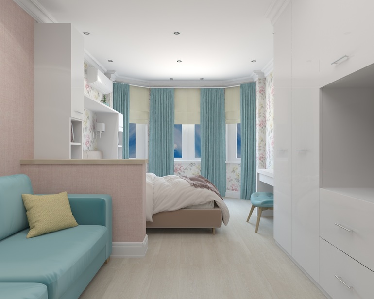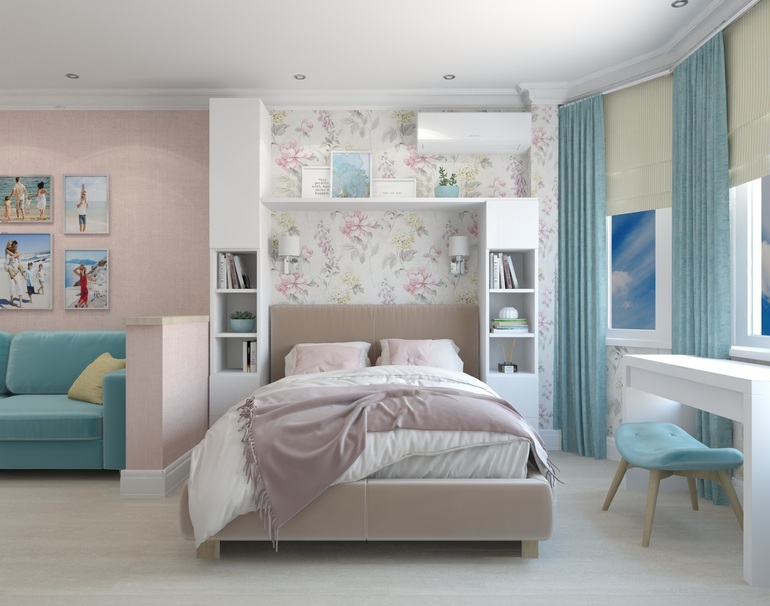 Было условие зонирования помещения и пастельные оттенки. небольшое рабочее место.