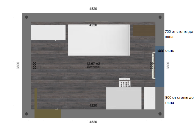 Хотелось бы разместить шкаф для одежды, рабочую зону-стол+стул и побольше места для хранения, так как очень много книг и игрушек,которые где-то надо хранить.
