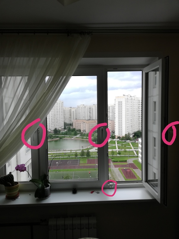 А вот уже поменяные окна - каждая створка открывается, на каждой створке ручка с замком от детей, на одной из двух вертикально откидывающихся створок, установлен второй спец замок от детей (обвела внизу справа). Ведь на откидной створке ручка открыта, и внизу идёт фикс в таком случае!