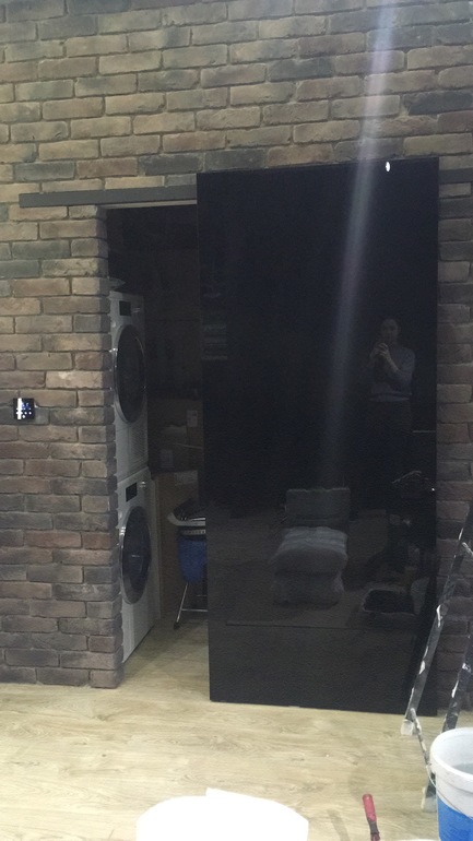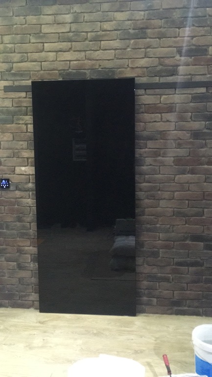 У этой двери есть свои моменты - она рельно тяжелая, трехлетний ребенок не отодвинет ее. И монтаж нужен специально обучеными людьми. Обычные работяги может и справятся, но не берутся. И еще, оказалось, что ее можно устанавливать только на гладкие стены, т.к. механизм едет по стене. Поэтому, в данном случае пришлось поплясать с бубном.