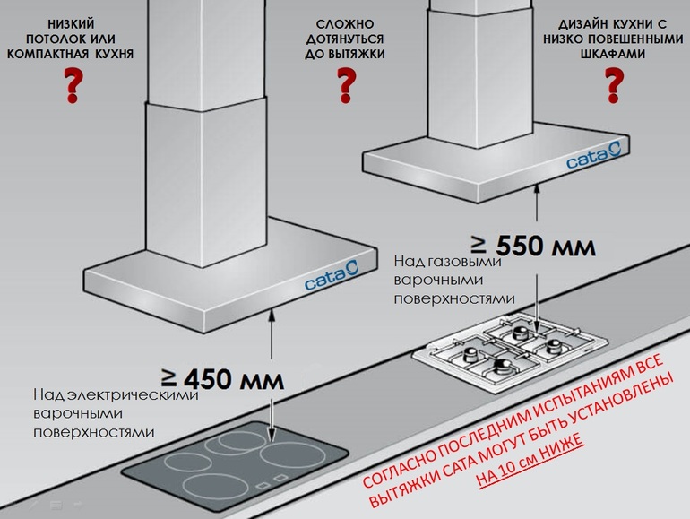 Вообще, должно быть в инструкции к вытяжке написано сколько минимальное расстояние до ВП. Но, насколько я понимаю, нельзя вешать вытяжку низко, если газовая ВП, а к индукции, не вижу проблемы сделать вровень