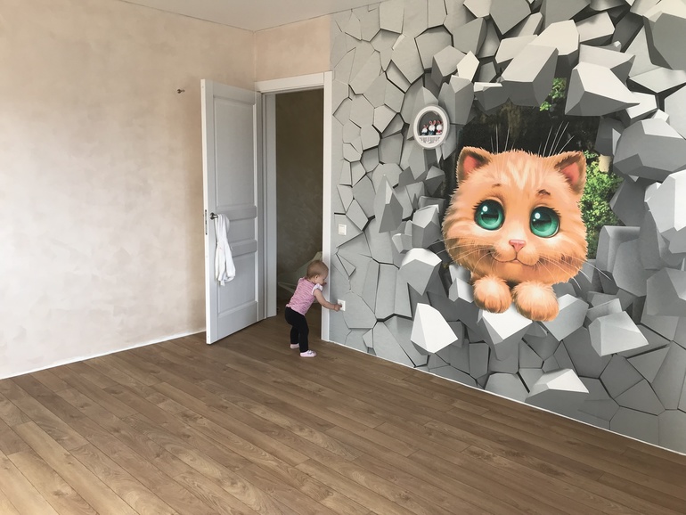 У нас точно так же, три стены однотон, а на четвертой фотообои сказочный замок https://picwalls.ru/wallpapers-kids/razdel/223 смотрится прекрасно и ребенок счастлив) Изготавливают их из экологически безопасных материалов, а размер мы смогли подобрать идеально и никаких стыков не видно, клеятся они очень легко