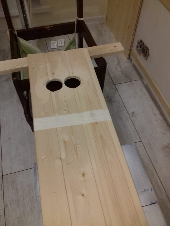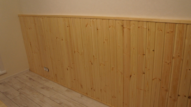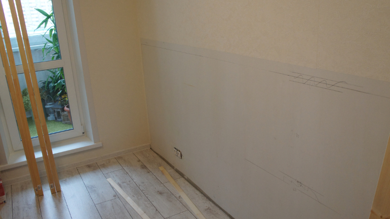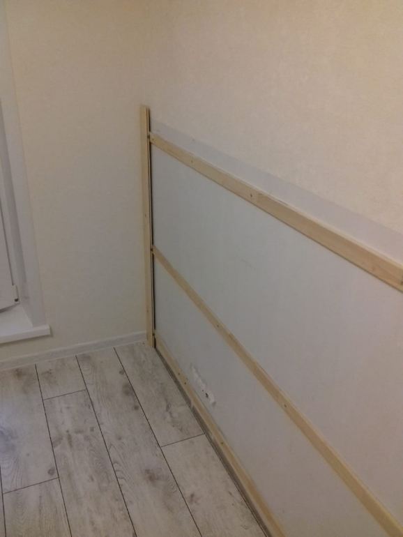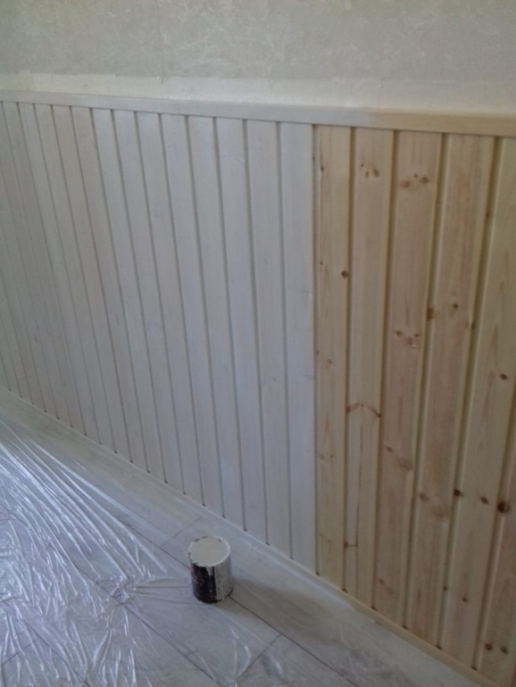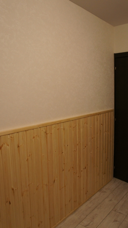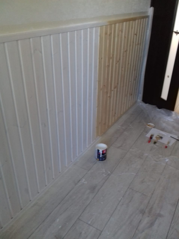 Ну и вагонка.Сложность была в том,что к этой стене примыкает дверь. Обрешетка,которую обычно делают минимум 2 см,плюс вагонка- дверь бы у нас не открывалась.Поэтому обрешетку сделали из тонких планок и сделали минимальную по толщине вагонку.Чтобы побыстрее и без пыли заранее в магазине ее обрезали.