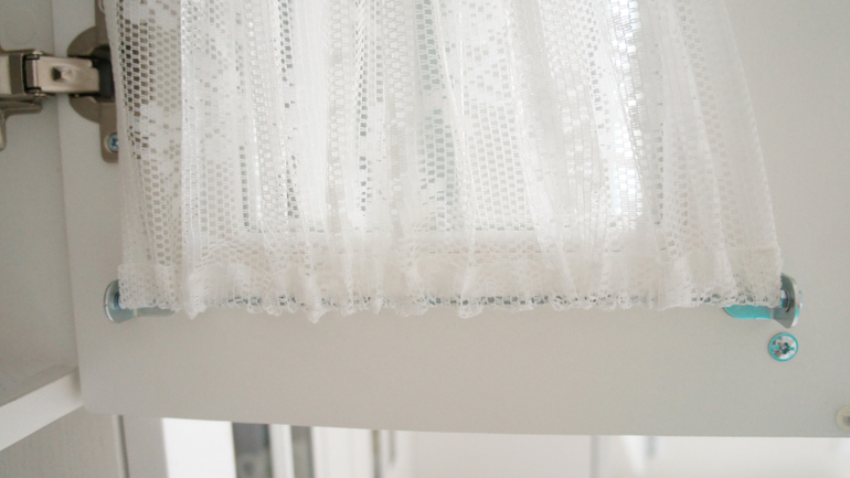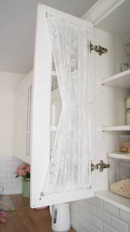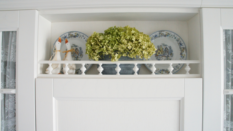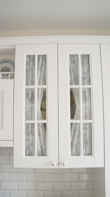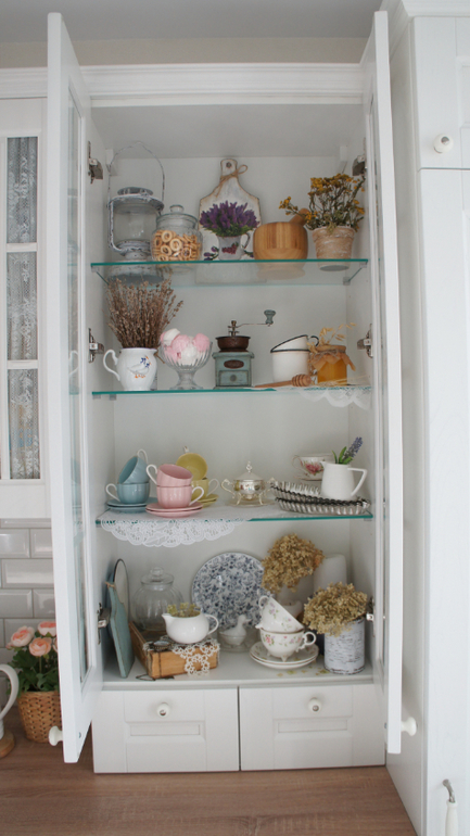 Как же прованс без штор на буфетах.Всё шила сама.Муж вошел в азарт и придумал сам крепежи,я хотела на веревочках и крючочках,но он сделал основательно.