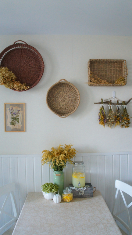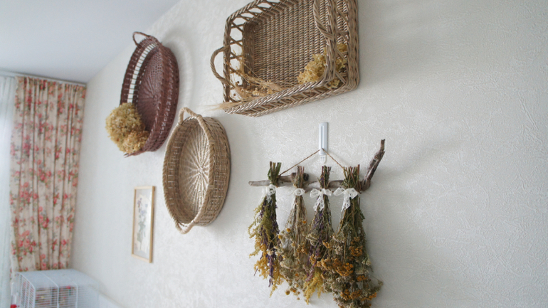 Вот такое необычное решение-корзины на стене- пришло мне в голову.Цветы также сушила сама.На самом деле стена еще у меня в оформлении,поэтому на временных крючках.Я еще не решила, как лучше.