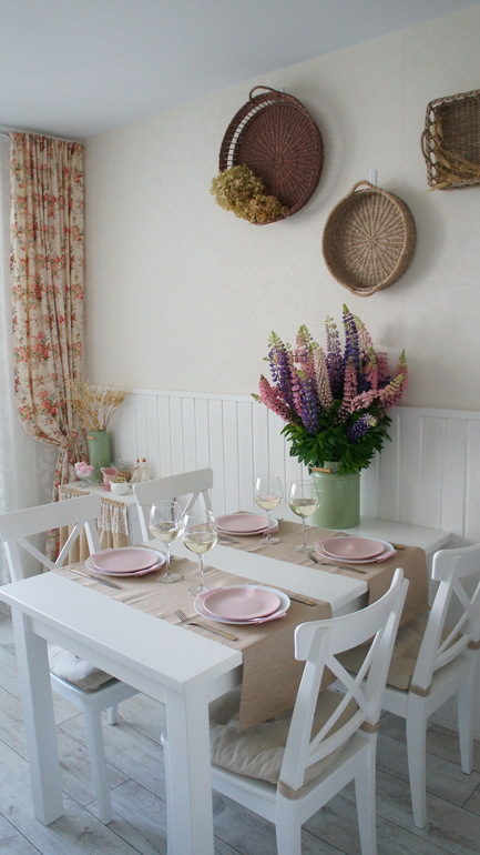 Шторы ,корзины заказывала на заказ у мастериц.Кстати,стулья похожи на икеа,но они на заказ из Дагестана делались.Вышло даже дешевле с учетом доставки.Поскольку в икее оказывается эти стулья молочные,а у меня стол белый.И такие стулья по всей Москве только молочные.Ох и намучилась я с ними тоже.